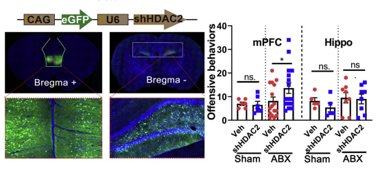Finally, this study has shown that sodium butyrate acts as an inhibitor of histone deacetylase 2 (HDAC2) to exert a protective effect across the blood-brain barrier into the brain. HDAC2 levels were increased in the medial prefrontal cortex (mPFC) region of rats after receiving antibiotic treatment, and decreased after intraperitoneal injection of sodium butyrate or intestinal transplantation with Clostridium butyricum. Specific knockdown of neuronal HDAC2 levels in the mPFC region of colony-disordered rats by viral tools promotes dominance (shown inFigure 2). In summary, this study reveals the epigenetic mechanism by which the gut-brain axis shapes social hierarchical status: antibiotic-induced gut flora disruption is followed by elevated levels of HDAC2 in the mPFC region of the brain, reduced excitatory postsynaptic currents, and ultimately a shift in hierarchical status.
