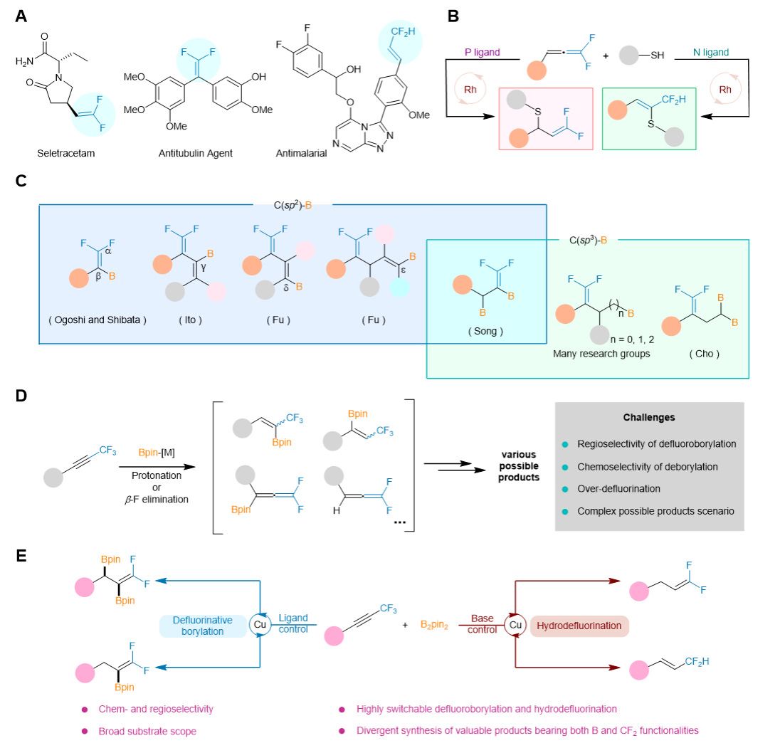 The CF2-containing alkenes, which typically serve as lipophilic isosteric andisopolar synthons to alcohols, amino, thiols or carbonyl groups, play critical roles in pharmaceuticals and drug design (Fig. A). Conventional approaches to access CF2-containing alkenes mainly involve the use of active pre-synthetic difluoromethylating reagents through electrophilic substitution, nucleophilic substitution, radical pathways, or difluorocarbene insertion. However, the modular synthesis of diverse CF2-containing alkenes from a single starting material remains underdeveloped. Only one known method has been identified for the synthesis of these valuable molecules with controllable selectivity: the rhodium-catalyzed regioselective nucleophilic addition of gem-difluoroallenes with thiols, enabling the formation of two types of CF2-containing olefins (Fig. B). Fluorine-containing organoboron compounds have emerged as novel synthons in organic synthesis due to the ease of converting C-B bond into various types of functional groups, which brings diversity and complexity to the target molecules. More recently, a range of elegant and intriguing works on the preparation of gem-difluoroalkenes containing C(sp2)-B bonds, such as β/γ/δ/ε-substituted C-B bonds, have been reported (Fig. C). Although the great progresses have been made, exploiting a unified system for selective construction of fluorinated organoboron skeletons with a controllable number of boronate moieties would present an appealing and highly adaptable strategy for synthesizing these valuable building blocks, potentially paving the way for novel approaches to the synthesis of fluorinated pharmaceutical candidates.