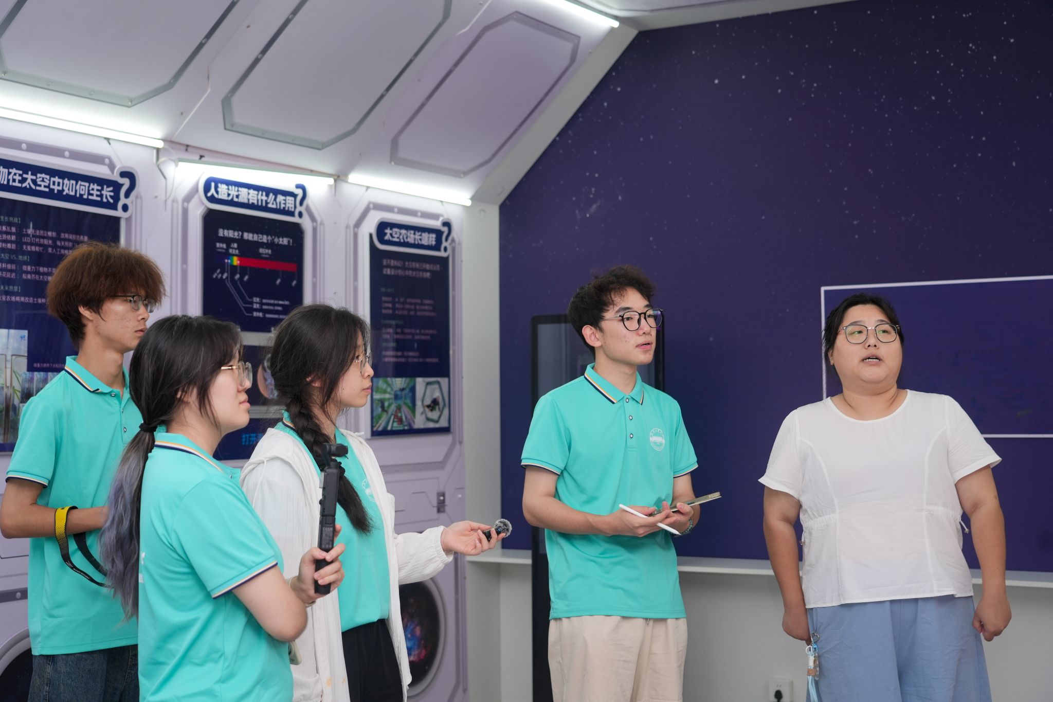 当日上午,团队成员到达π客工场,在基地航天育种科普展厅,负责人金依涵向团队成员详细介绍了展厅中太空育种的项目背景及研学体验的具体细节,航天与生命科学内容融合于互动装置和展板中,一部种子“飞天遁地”的壮阔史诗徐徐展开,丰富的“太空种子”陈列与中国航天育种成就展示令人惊叹。
