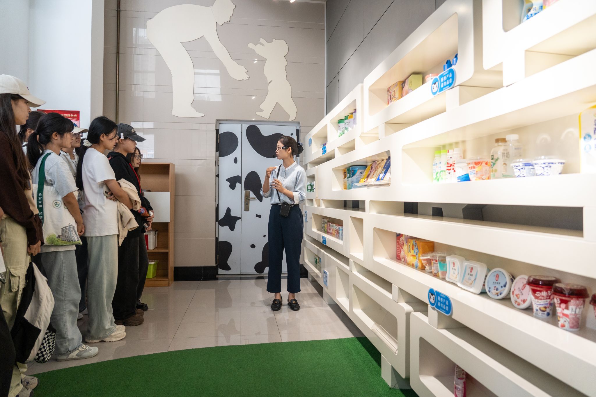 活动开始,在人力资源招聘负责人疏洋的引导下,师生们共同观看了伊利集团的宣传片。宣传片全面展示了伊利集团的发展历程以及乳制品研发成绩,让新生们对伊利集团有了初步且深刻的认识。随后,讲解员邓富珍展示了伊利集团旗下的全系列明星产品,并在生产车间参观走廊,详细地介绍了从原奶的接收与检验,到无菌灌装,再到包装运输等生产流程,拓宽了同学们对现代企业的认知。
