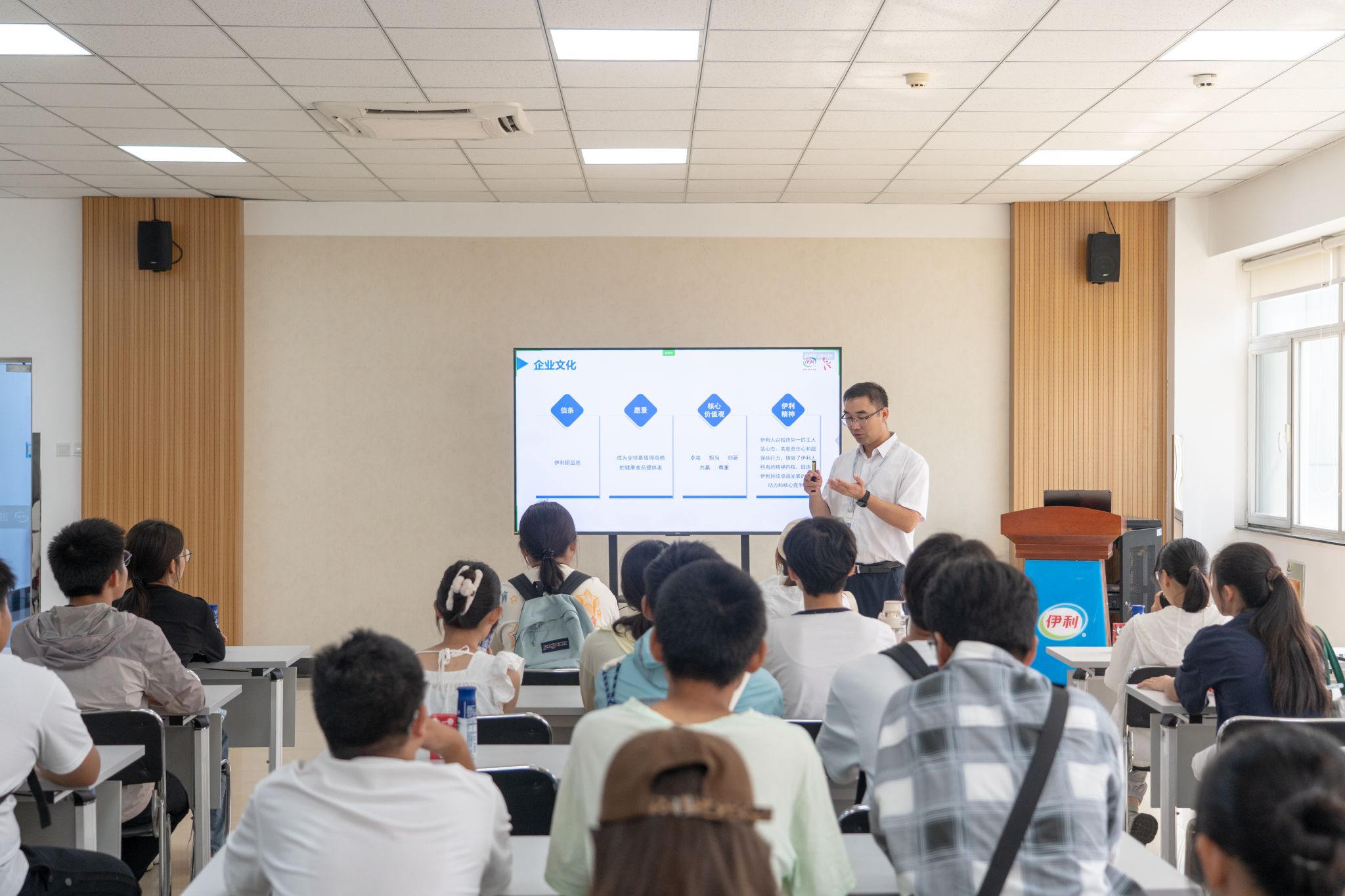 参观后,企业HRBP经理杨帆讲授“企业公开课”,围绕用人理念、企业文化、岗位需求等,鼓励同学们夯实专业素养、提升综合能力。随后,合肥伊利在职员工、365电子娱乐官方网站2024届硕士毕业生查杨,围绕个人职业经历与入职适应过程展开分享。他结合自身求职实践经验,向同学们提出“尽早确立求职目标、提前开展求职准备”。