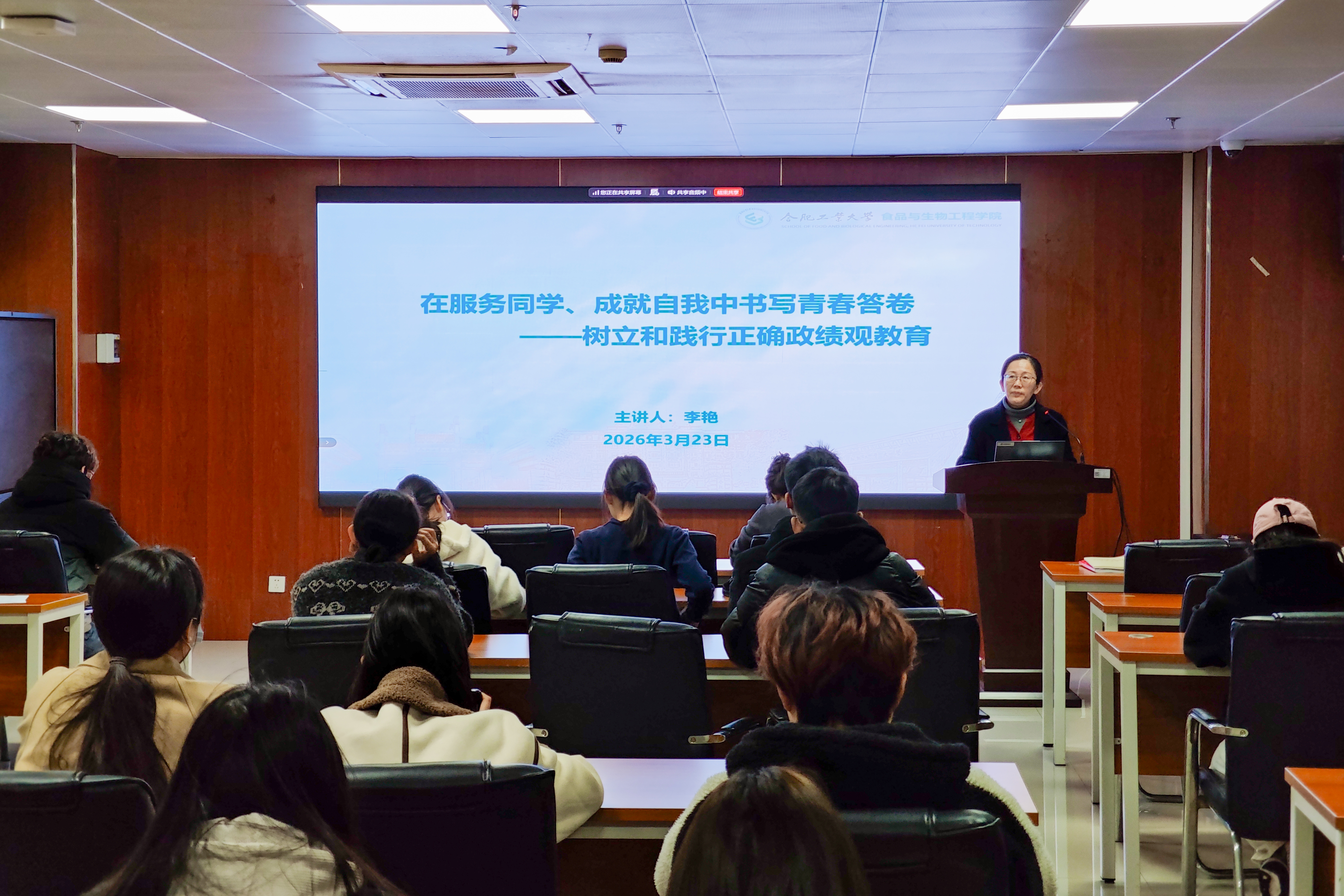 为认真贯彻落实党的二十届四中全会精神,扎实开展树立和践行正确政绩观学习教育,3月23日晚,365电子娱乐官方网站在食生楼206开展主题为“在服务同学、成就自我中书写青春答卷——树立和践行正确政绩观教育”主题党课。此次党课由学院党委副书记兼纪委书记李艳讲授,学院党员代表近百人参加学习。