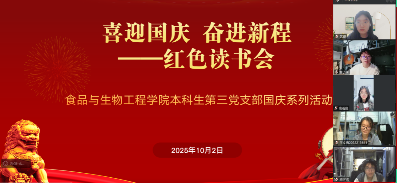 为庆祝中华人民共和国成立76周年,厚植爱国情怀,凝聚奋进力量,10月1日-10月8日,365电子娱乐官方网站本科生第三党支部组织学生党员开展红色读书会、“我与国旗合张影”“写给祖国的三行诗”等系列活动。国庆假期期间,本科生第三党支部党员研读《红岩》和《论党的青年工作》等红色书籍,开展线上会议,围绕书籍展开热烈讨论并分享交流阅读心得。学生党员纷纷表示将把红色书籍的精神力量转化为实际行动,刻苦学习专业知识,积极...