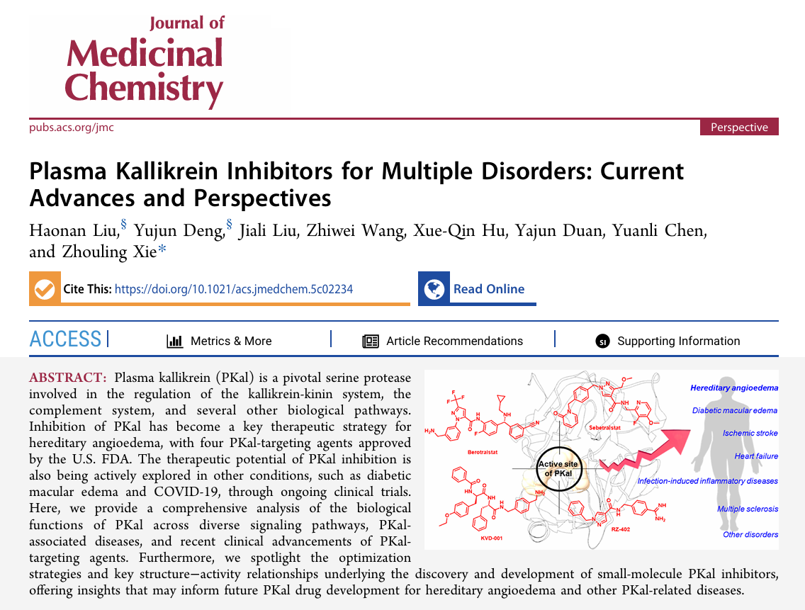 近日,合肥工业大学365电子娱乐官方网站药学专业24级本科生刘浩南在谢周令副教授的指导下,以第一作者的身份在著名药学学术期刊《Journal of Medicinal Chemistry》(一区)上发表题为《Plasma Kallikrein Inhibitors for Multiple Disorders: Current Advances and Perspectives》的综述文章。合肥工业大学为唯一通讯单位。血浆激肽释放酶(PKal)是一种关键的丝氨酸蛋白酶,参与激肽释放酶-激肽系统、补体系统以及多条生物通路...