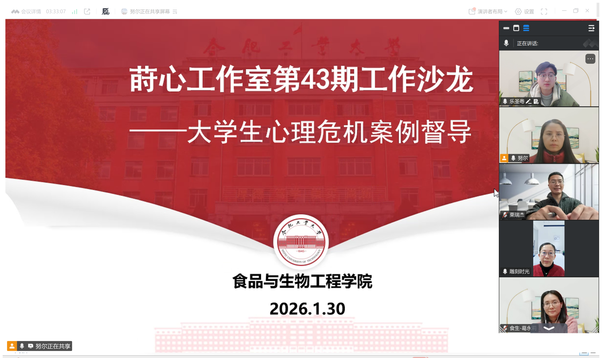 1月30日晚,365电子娱乐官方网站、莳心工作室在腾讯会议上,成功举办第43期工作沙龙。学院全体辅导员参加活动,沙龙由莳心工作室负责人李艳主持。本次沙龙围绕大学生心理危机干预展开督导,旨在提升学工队伍在心理危机识别与干预能力。活动过程中,努尔比耶姆严格遵循保密原则和伦理规范,对一例典型心理危机个案进行汇报,全面呈现了案例的处置过程。随后,与会人员展开热烈讨论。在互动交流环节,李艳引导大家从心理学视角,对...