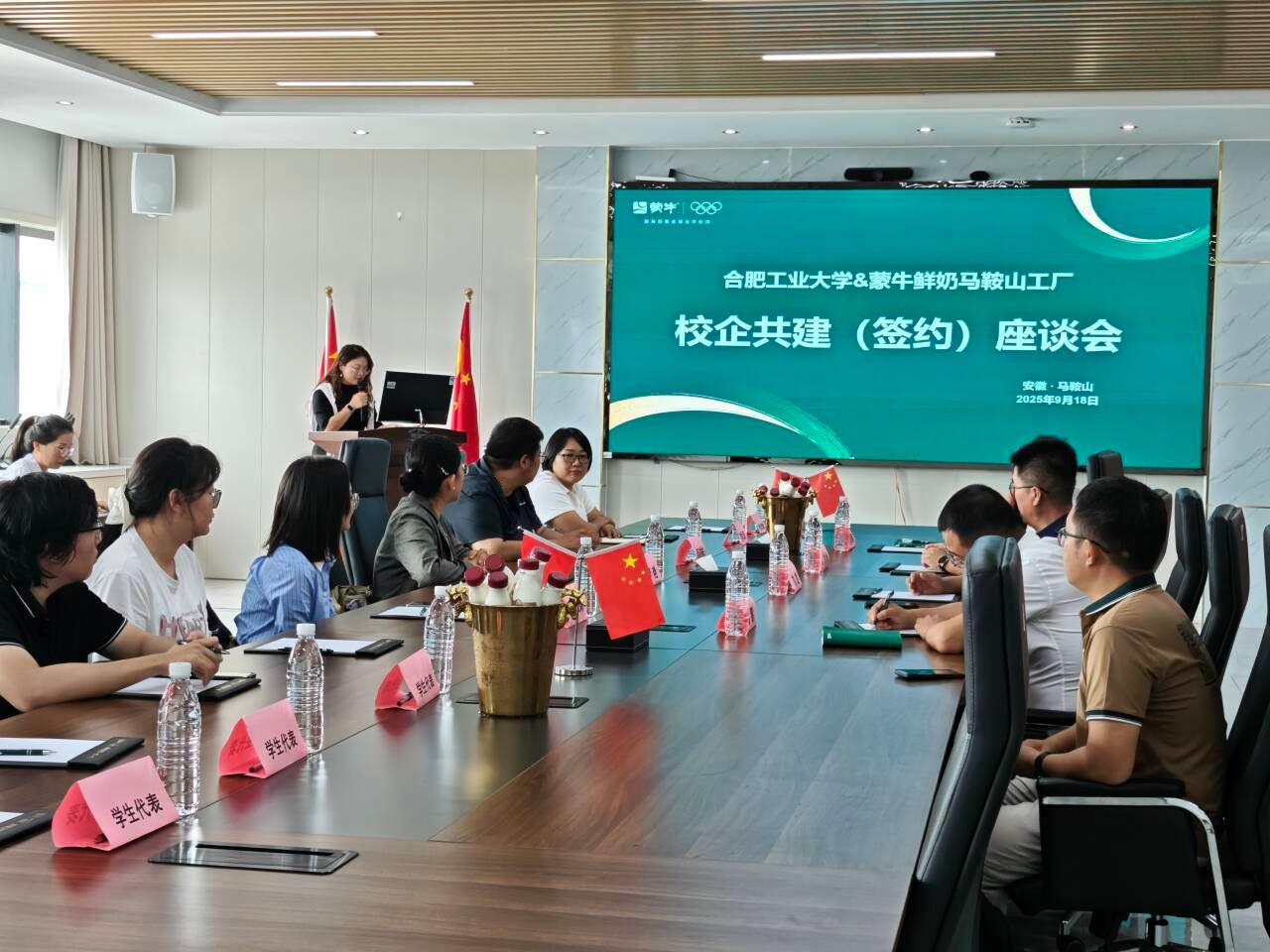 上午,师生一行与蒙牛乳业(马鞍山)有限公司相关负责人开展校企合作座谈会。首先,蒙牛乳业(马鞍山)有限公司鲜奶人事行政经理王丽娜介绍了企业规模、产品种类、企业文化、招聘需求等相关情况。接着,李艳从365电子娱乐官方网站、学科专业、人才培养、科学研究、就业情况等方面介绍学院情况。随后,蒙牛鲜奶马鞍山工厂厂长刘旋代表企业与学院签订《大学生就业实习基地协议书》,并举行授牌仪式。最后,校企双方在就业实习、企业参观、产学研合作等方面达成一致意见,现场学生就自己关心的问题,与企业相关负责人进行交流。最后,在厂长刘旋、运营经理刘岭、运营经理彭鹏的陪同下,师生一同参观了生产车间和党建馆,并达成了党支部共建的共识。通过座谈和参观,学生对企业有了深入的了解,毕业班同学现场投递简历。