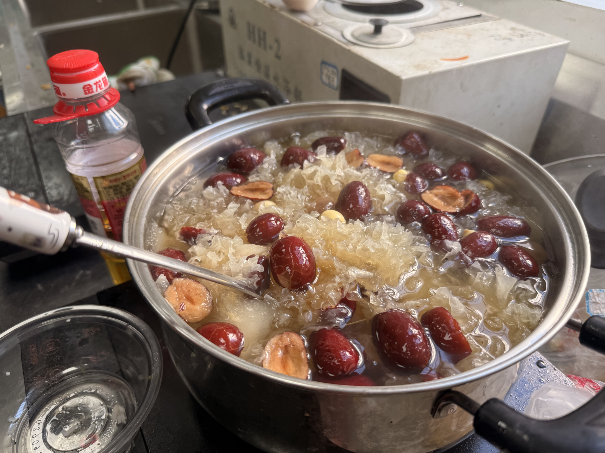 而在银耳雪梨汤制作区,同学们则展现了细腻与耐心。银耳被仔细清洗并撕成小朵,雪梨去皮去核后切成滚刀块,与红枣、冰糖一同放入锅中,加水慢炖。在小火慢熬的过程中,银耳逐渐软糯出胶,雪梨吸收了汤汁的清甜,红枣的香气融入其中,整个实验室弥漫着温润香甜的气息。大家不时交流炖煮技巧,调整火候与时间,感受着慢煮美食的治愈与乐趣。