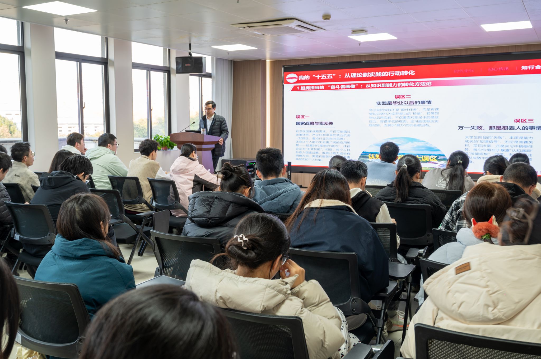 授课中,徐宝才带领全体学生全面梳理我国“十四五”期间取得的历史性成就;重点解读中国共产党第二十届中央委员会第四次全体会议公报和《中共中央关于制定国民经济和社会发展第十五个五年规划的建议》,引导学生把握时与势,锚定未来发展新目标;结合80周年校庆大事件与优秀校友事迹,深刻阐述合肥工业大学工业报国的红色基因,引导广大青年学生认清当前历史方位,实现从理论到实践的行动转化,将个人理想与国家战略同频共振。同学们备受鼓舞,决心以青春之我砥砺奋进,在波澜壮阔的实践中锤炼过硬本领,未来必将成为堪当民族复兴大任的栋梁之材。