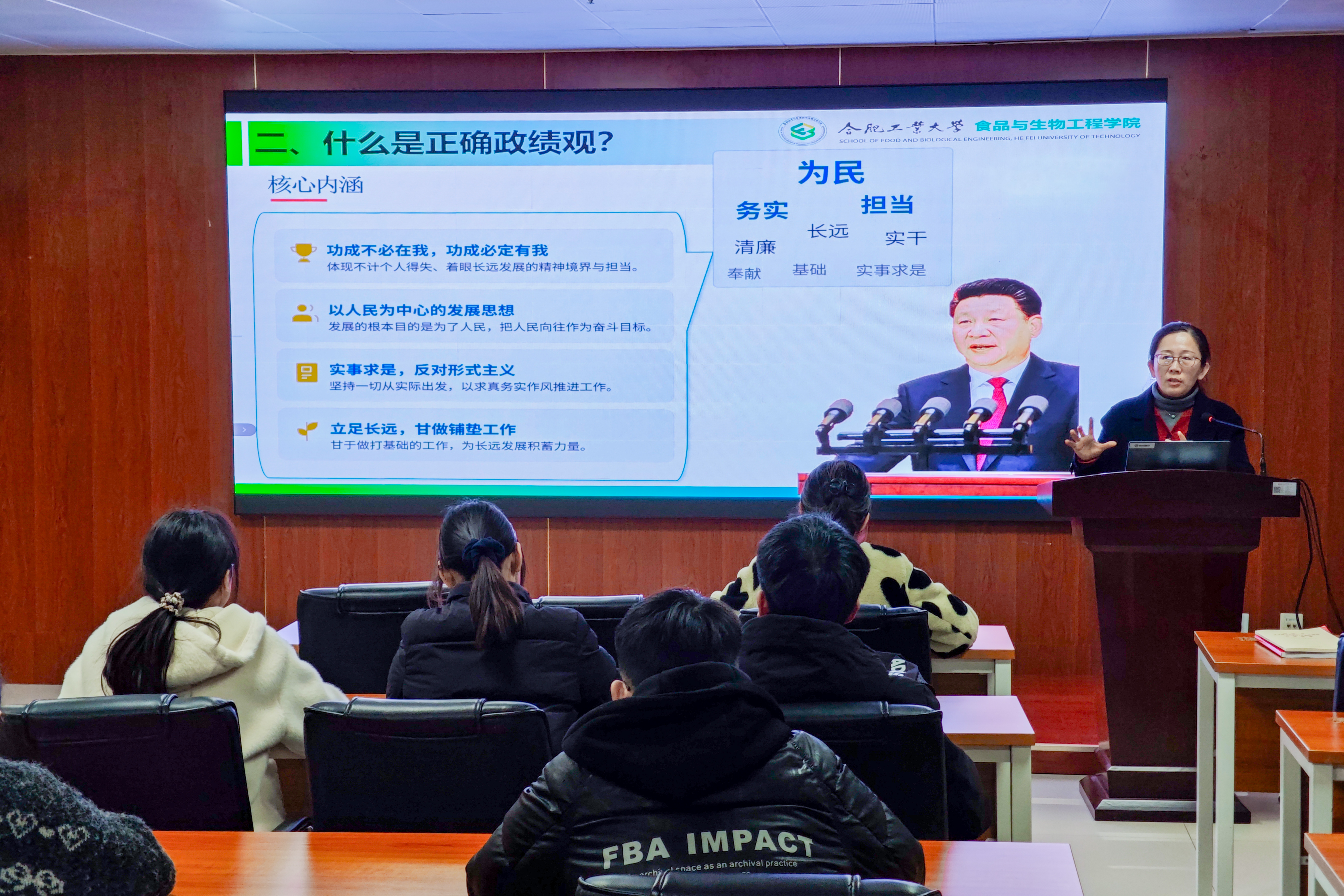 为认真贯彻落实党的二十届四中全会精神,扎实开展树立和践行正确政绩观学习教育,3月23日晚,365电子娱乐官方网站在食生楼206开展主题为“在服务同学、成就自我中书写青春答卷——树立和践行正确政绩观教育”主题党课。此次党课由学院党委副书记兼纪委书记李艳讲授,学院党员代表近百人参加学习。