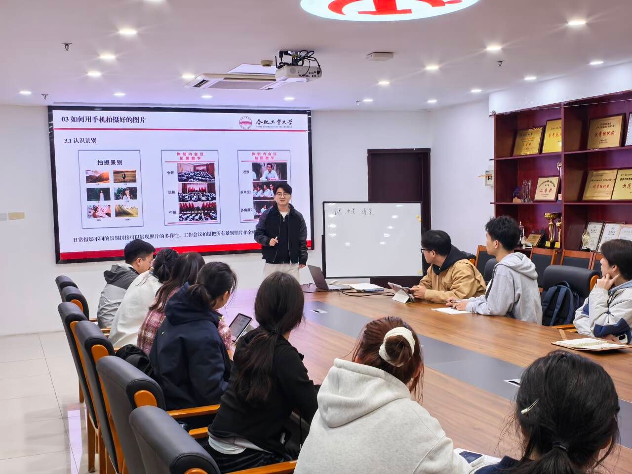 在授课环节,乐圣粤围绕“如何拍摄好活动图片”这一主题展开细致讲解。从拍摄景别的基础认知,到全景、中景、近景等不同构图的实操演示,再到日常摄影中景别拼接的技巧,内容层层递进、深入浅出。乐圣粤老师结合大量实例,直观展示了不同构图、光线运用对画面效果的影响,帮助学员快速理解摄影构图的核心逻辑与实用技巧。现场学员认真聆听、仔细记录,并就实际拍摄中遇到的问题进行互动交流,学习氛围浓厚。