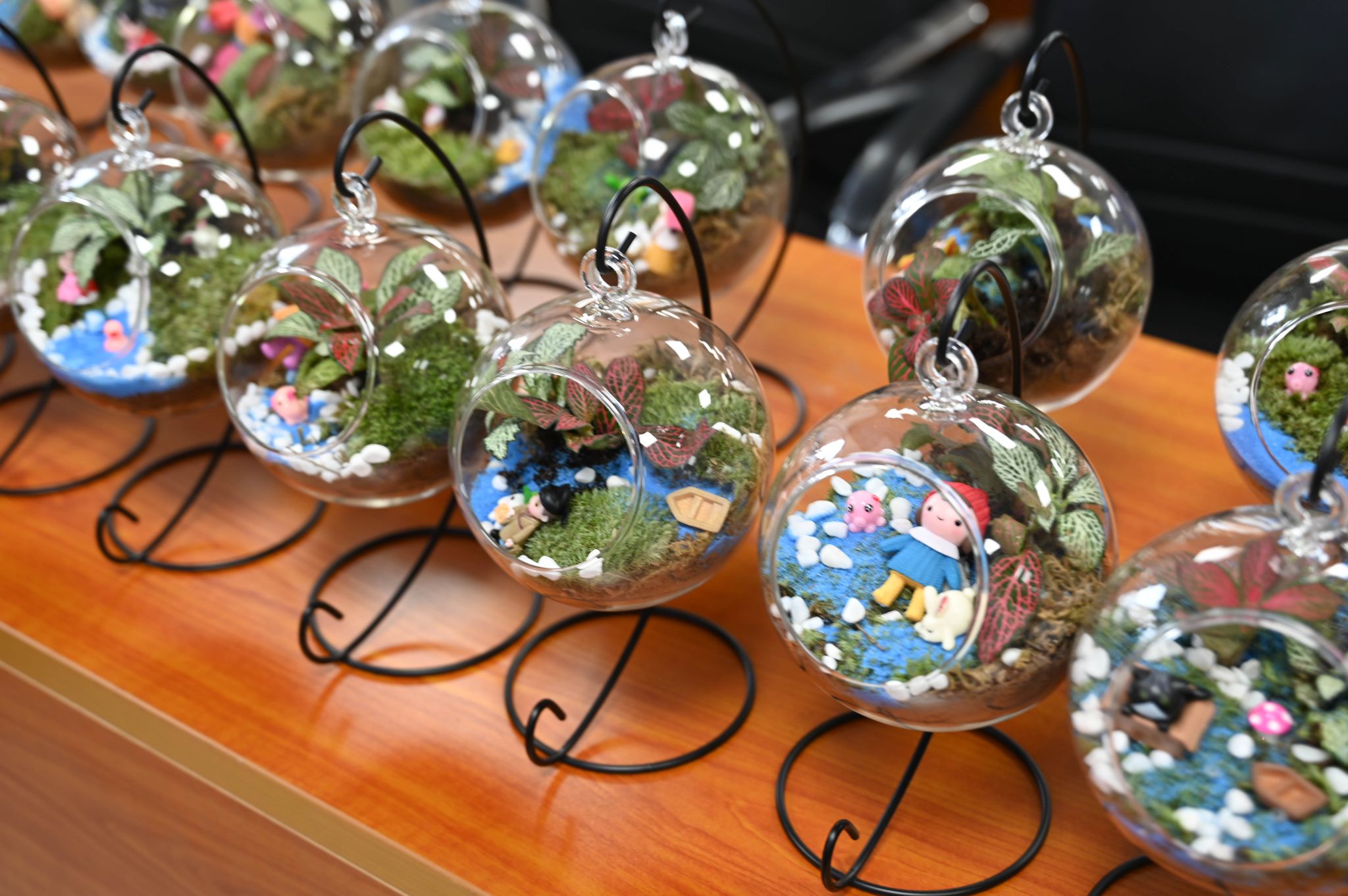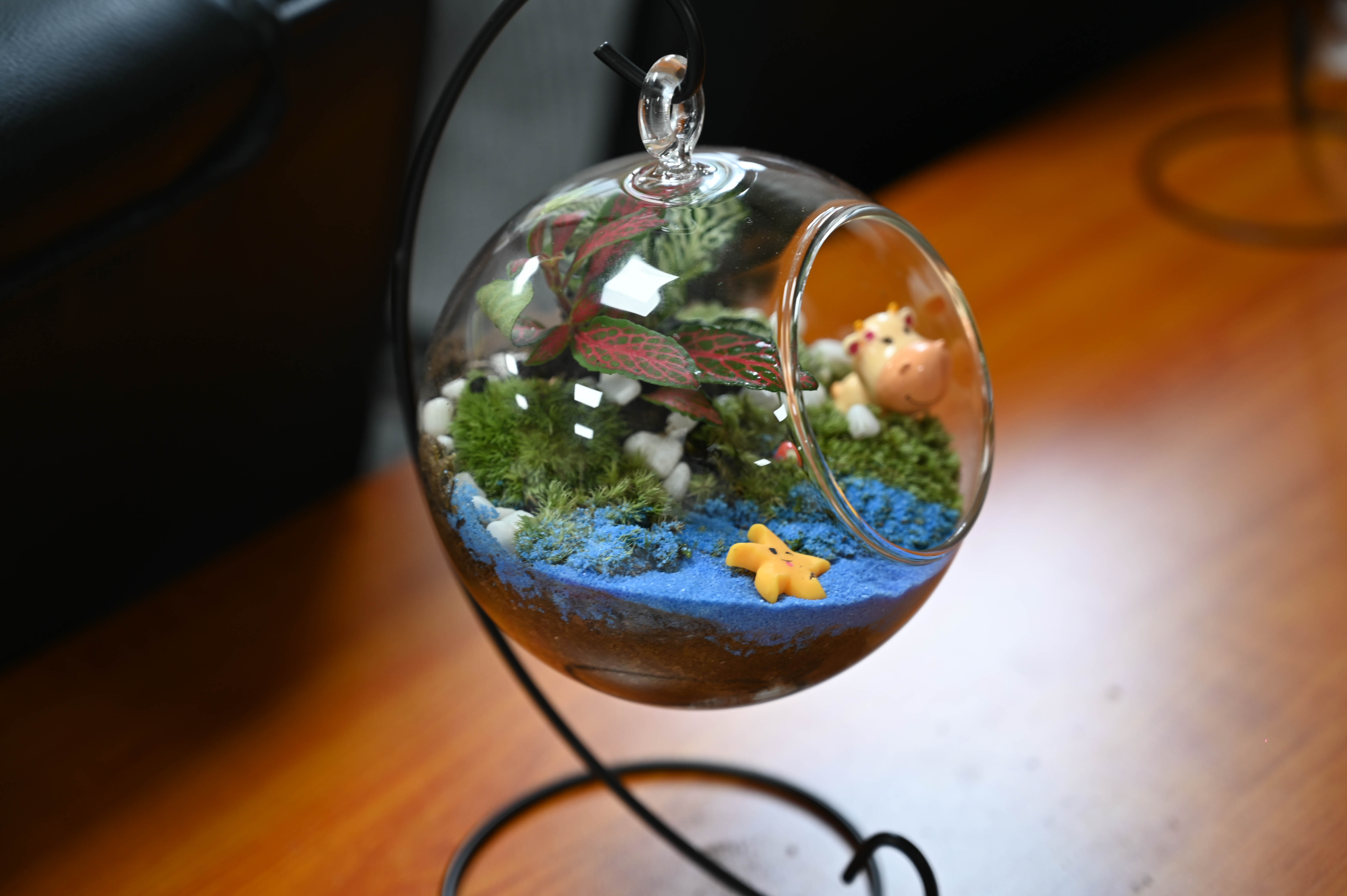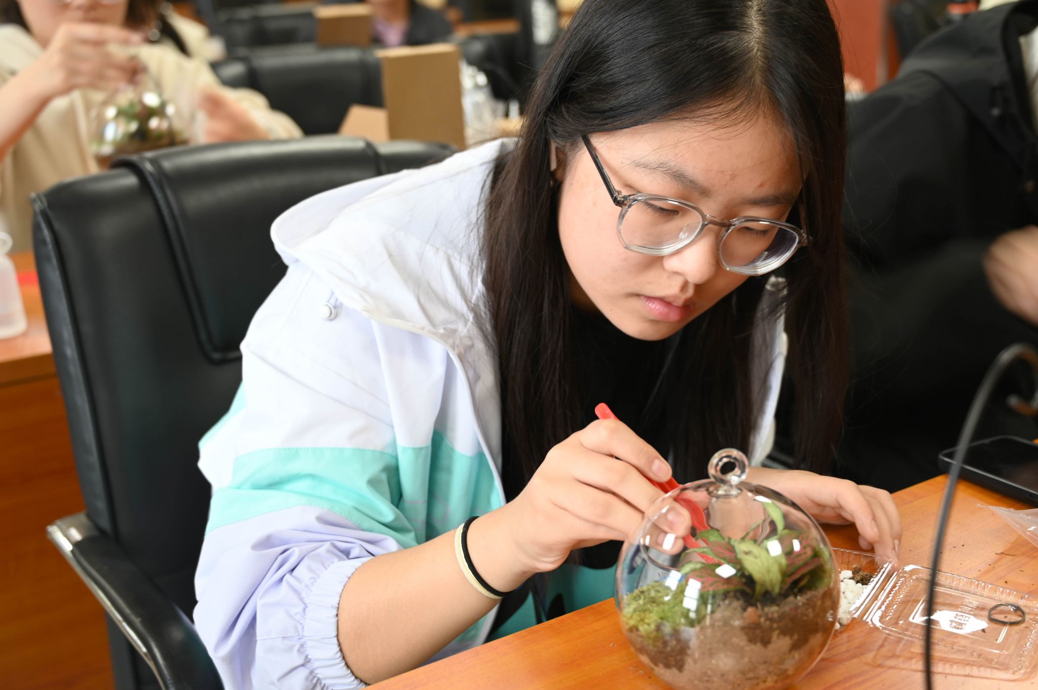 活动伊始,努尔比耶姆介绍了园艺疗法“静心凝神、疗愈情绪”的理念,从苔藓的静谧到蕨类的生机,引导同学们在绿意中感受自然疗愈的力量。接着,她带领同学们学习了微景观瓶的制作流程和技巧后,开启了一场充满创意与趣味的心灵之旅。随后,同学们充分发挥想象力与创造力,以苔藓、蕨类等绿植为媒介,在砾石与陶粒的基底上铺展生态画卷。从基质铺设到绿植搭配,从细节雕琢到整体构思,同学们以指尖触碰自然的温度,在一铲一植中沉淀心绪,将散落的材料凝练为微缩的绿色世界。