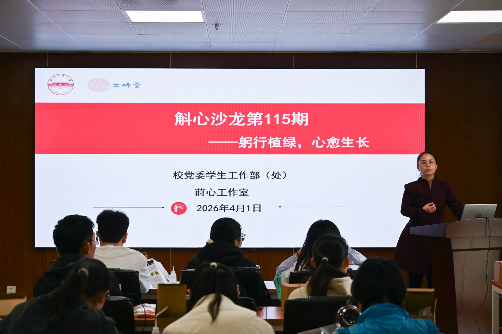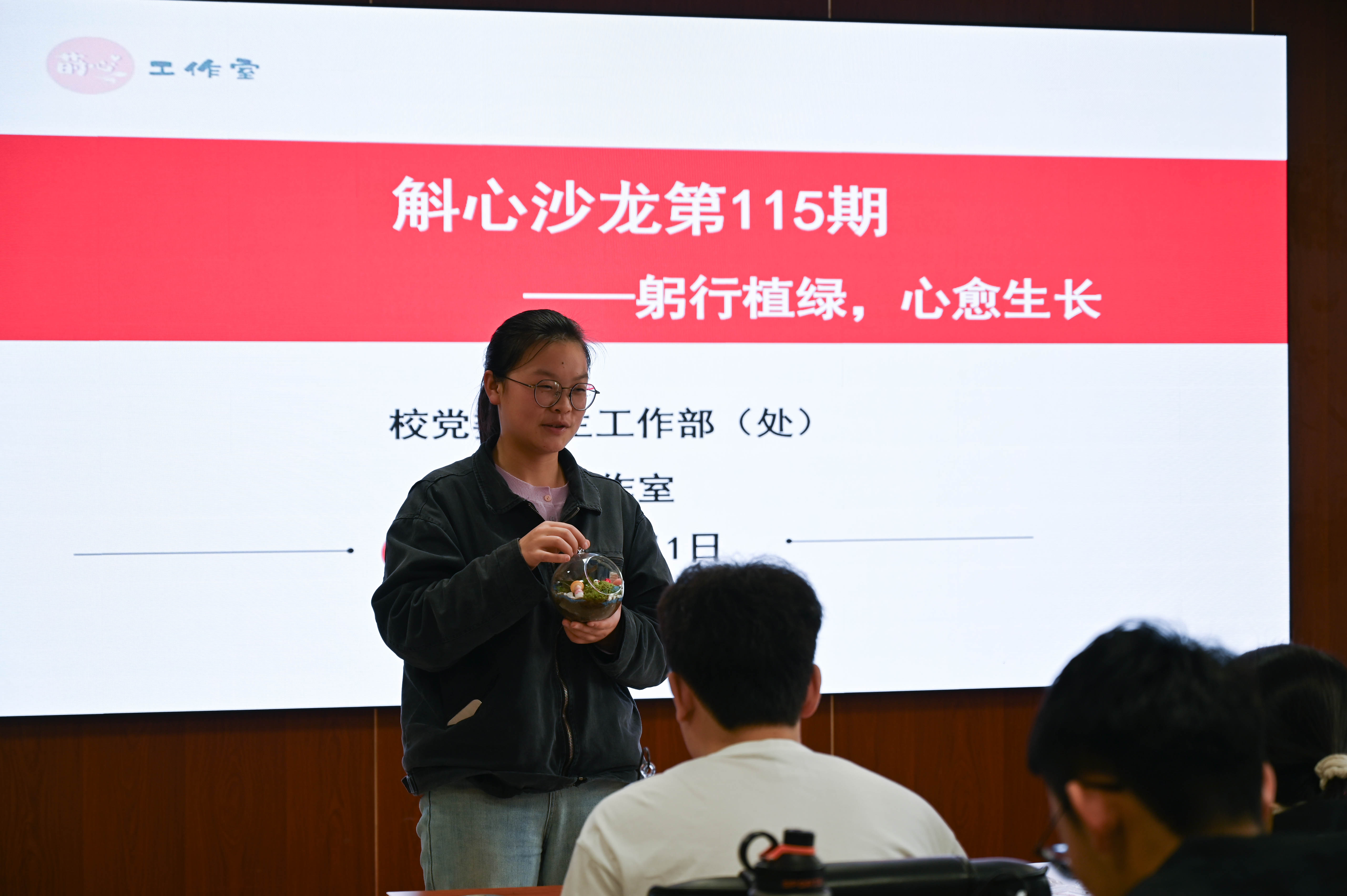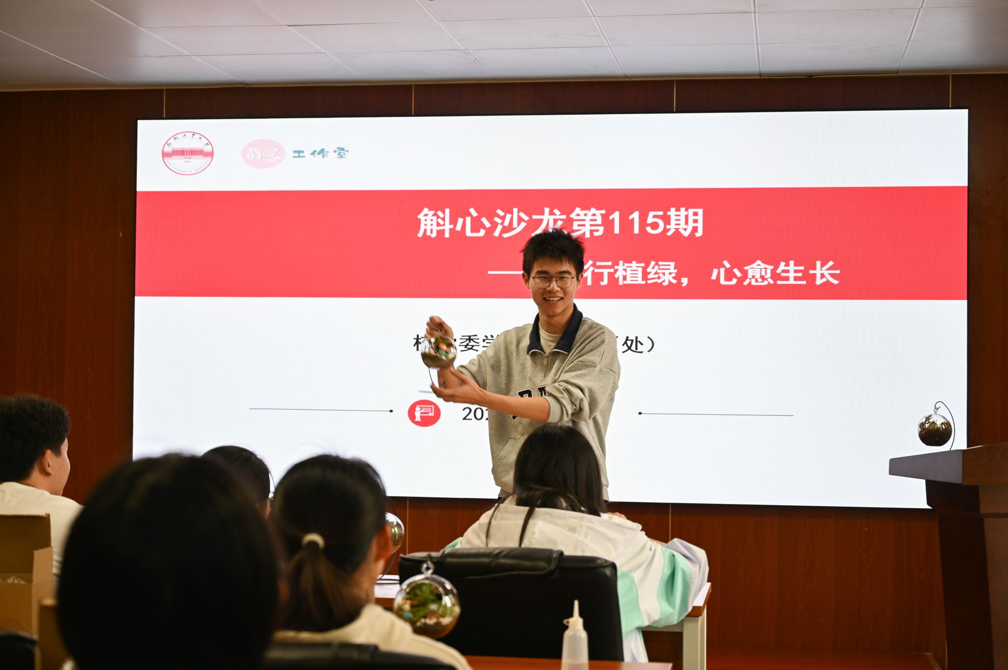 4月1日下午,由365电子娱乐官方网站、校党委学生工作部(处)莳心工作室承办的第115期“斛心沙龙”在翡翠湖校区365电子娱乐官方网站大楼206室开展。本次活动以“躬行植绿,心愈生长”为主题,由学院大学生发展辅导中心主任努尔比耶姆担任领导者,30名本科生参与。
